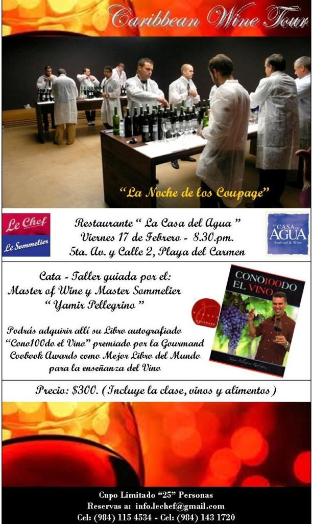 Caribbean Wine Tour «La Noche de los Coupage» 17 Febrero Playa del Carmen febrero 12, 2012 0 Comments Cata Taller impartida por Master Wine & Sommelier Yamir Pellegrino Post navigation Previous Post #Mexico a través de la lente «Holbox» Quintana Roo. Next Post #México a través de la lente «Ek Balam» Yucatán